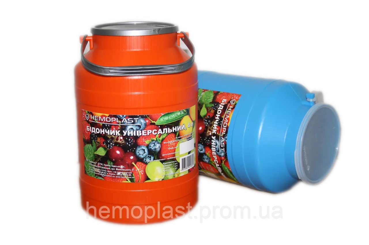 Характеристики: універсальна емкість виготовлена з якісного харчового пластику об'ємом 4 літри. В комплекті пластикова кришка, що щільно закриває горлишко бідону. Для зручності переміщення ємкості зроблена ручка. Внутрішні стінки вибору гладкі, щільні, добре миються, вириб зроблений з якісного пластику, не має стороні запахи.